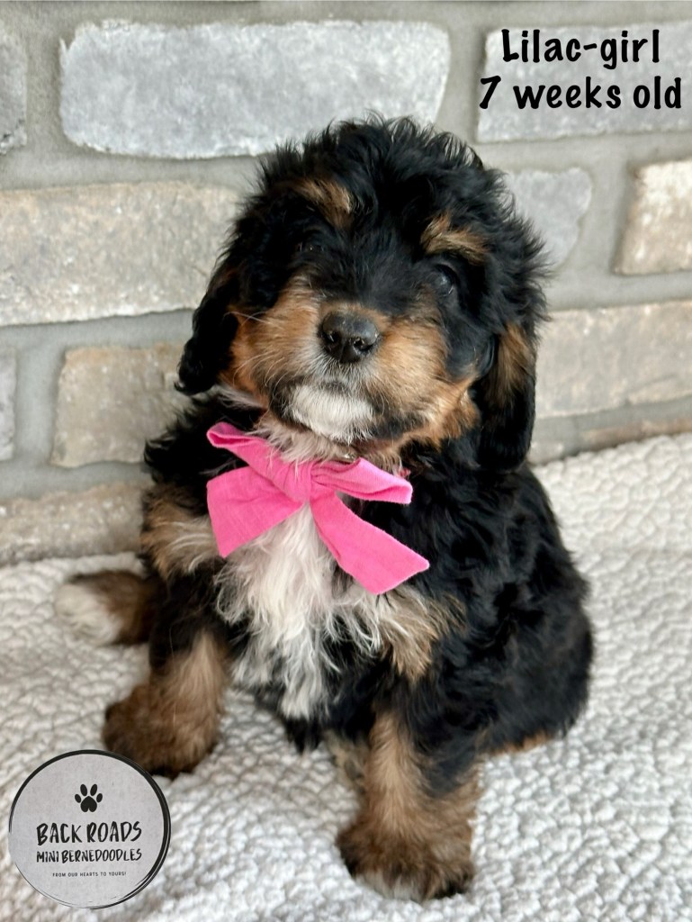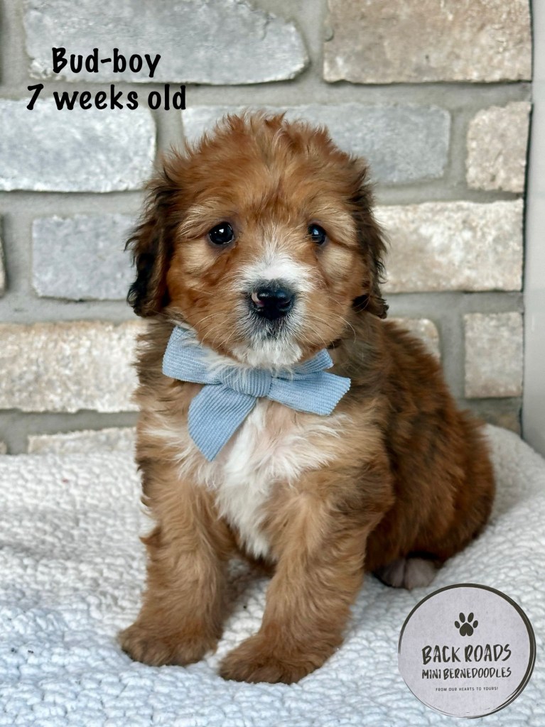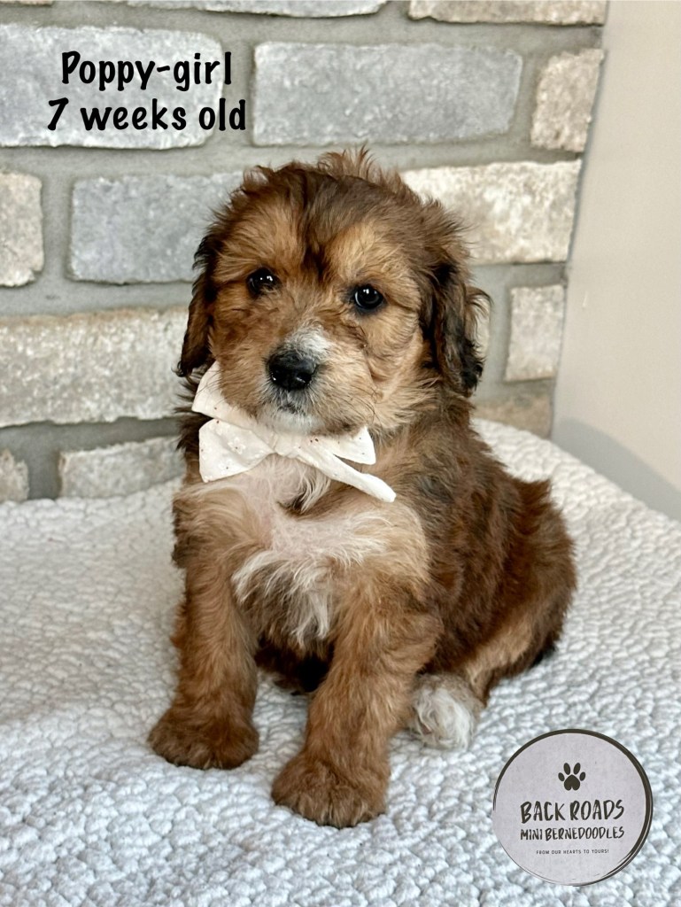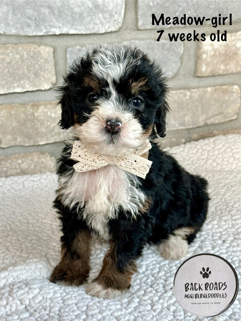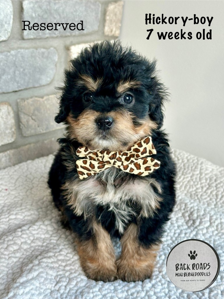 All of our puppies are F1 Miniature Bernedoodles, meaning they are first generation. The Dam is a Bernese Mountain Dog and the Sire is a Miniature Poodle. Expected adult weight is between 32-50lbs. They are considered to be hypoallergenic. Life expectancy is 15-17 years.