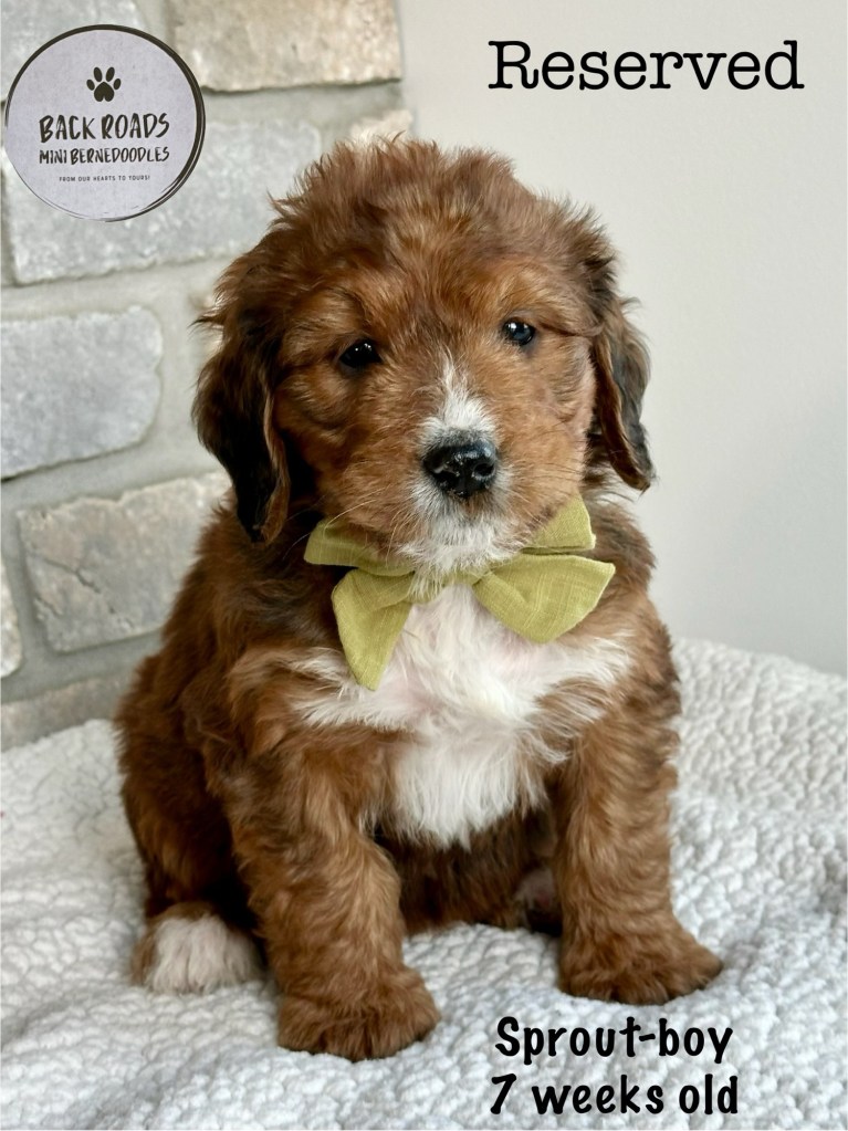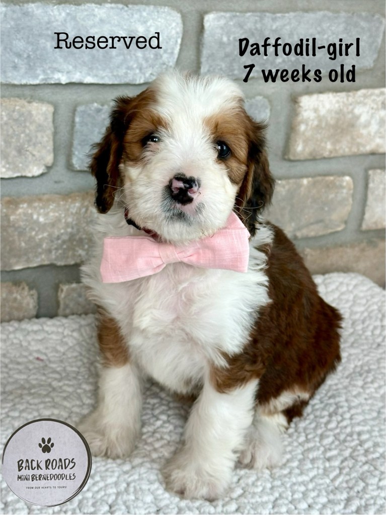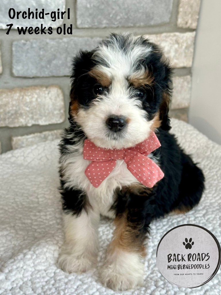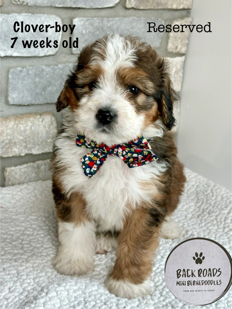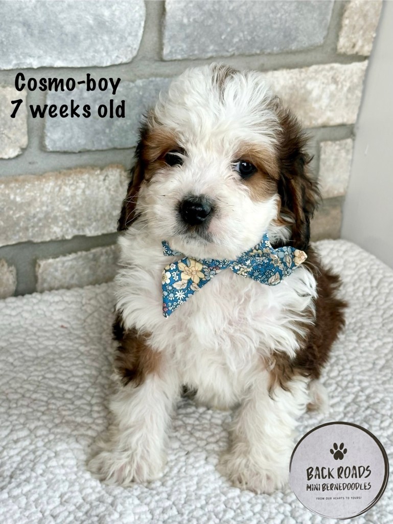 All of our puppies are F1 Miniature Bernedoodles, meaning they are first generation. The Dam is a Bernese Mountain Dog and the Sire is a Miniature Poodle. Expected adult weight is between 32-50lbs. They are considered to be hypoallergenic. Life expectancy is 15-17 years.